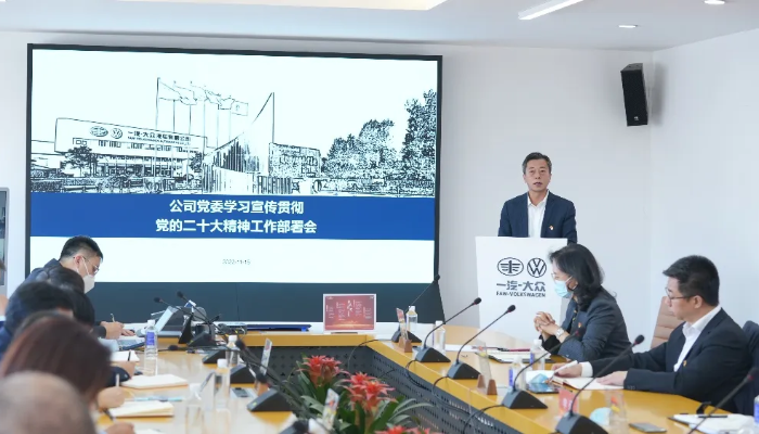 會議傳達了集團公司黨委關于學習宣傳貫徹黨的二十大精神的工作要求,并從學習研討、專題培訓、宣講交流、宣傳引領、全員貫徹、實踐落實六個方面對《一汽-大眾公司黨委學習宣傳貫徹黨的二十大精神工作方案》進行說明、部署工作。